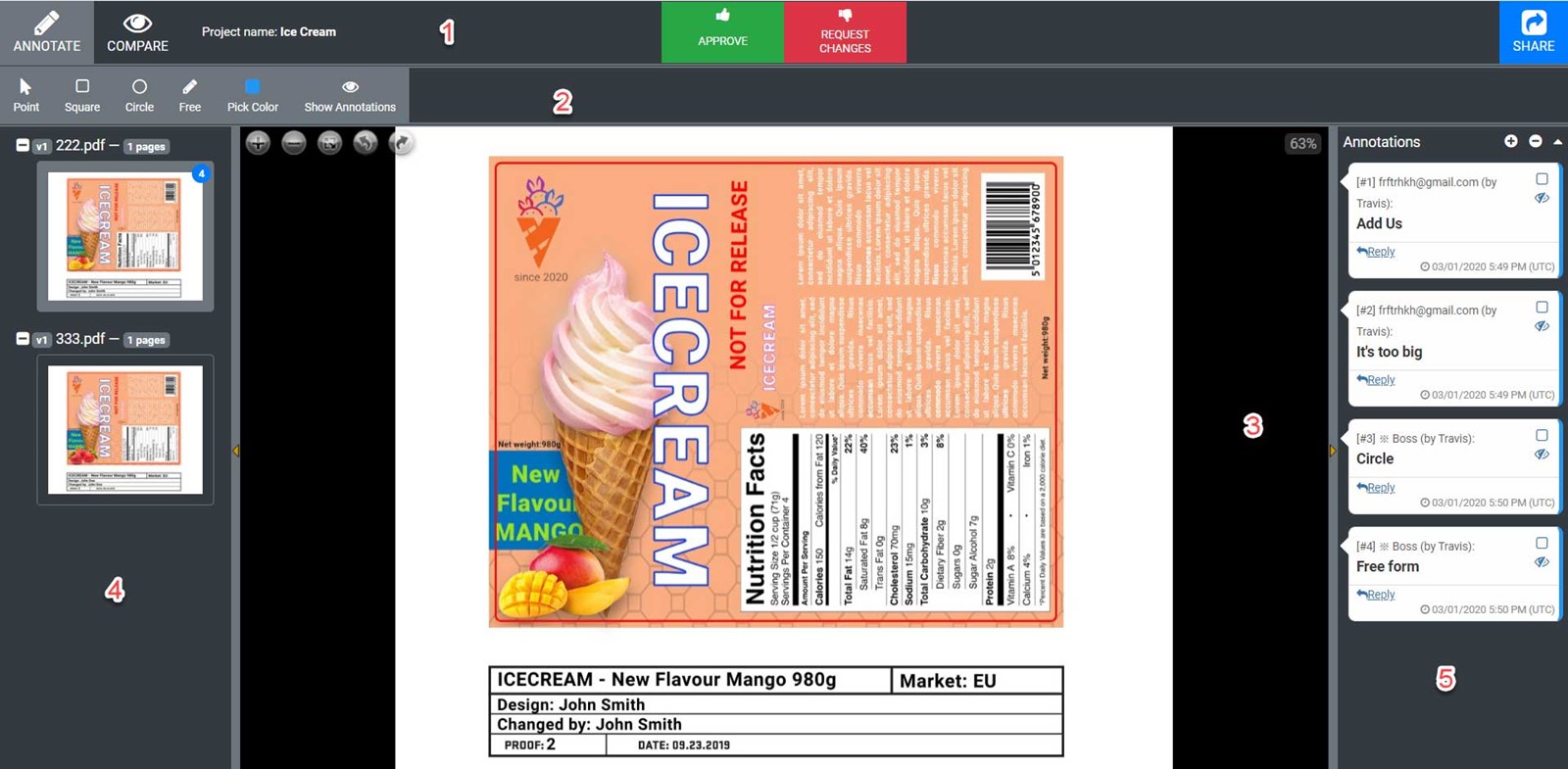 1) The main panel - contains an action button, that allows switching between annotating and compare modes, decision buttons, and share buttons.